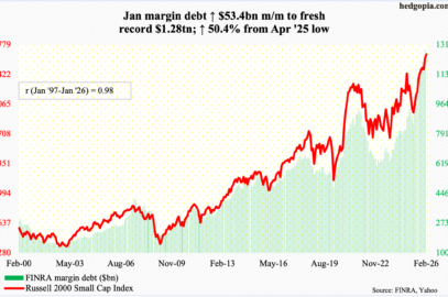 Margin debt hit a new high in January, up $150 billion over four months. Large-cap indices, however, have gone sideways since late October; this is also the case with small caps, but only... READ MORE