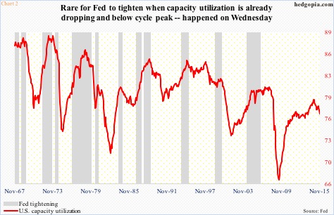 Once again, going back nearly five decades, it is not often the Fed begins to tighten when utilization is dropping from a cycle peak.  In Chart 2, this took place in 1974, 1980 and 1999, with each of these years with its own unique characteristics.  As relates to both 1974 and 1980, tightening had begun much earlier – 1972 and 1976, respectively.  Inflation was a big problem back then, and Paul Volker was on the case.  And 1999… well, the less said the better.