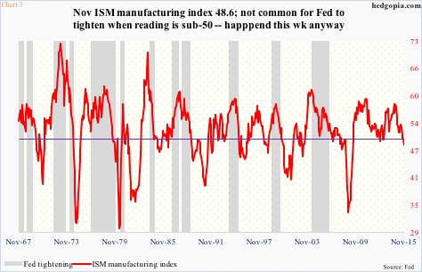 Lastly, the ISM manufacturing index dipped into contraction mode in November.  The 48.6 reading was the first sub-50 reading in three years.  In nearly five decades now, only once has the Fed tightened when manufacturing was contracting.  That was August 1980, with different sets of circumstances.  Mr. Volcker was trying to stomp out inflation.  The tightening campaign had begun much earlier, with the fed funds rate rising 50 basis points to 10 percent in August 1980.  Nothing like today, with rates near zero.