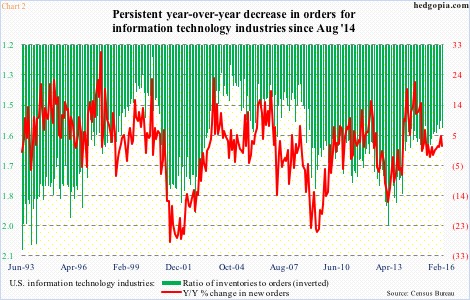 Based on data put out by the Census Bureau, orders for computers and electronic products peaked at a seasonally adjusted annual rate of $25.8 billion last November. March was $25.1 billion, down 1.6 percent year-over-year. This was the first y/y decline since December 2013. As early as December 2014, orders were growing at 14.8 percent.