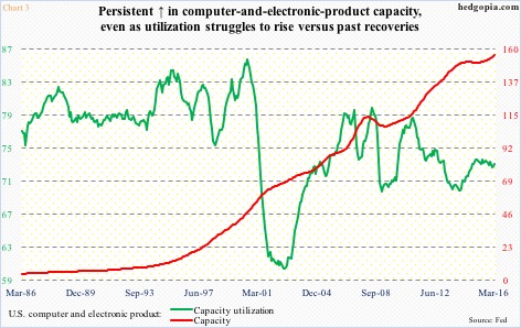 Chart 3 plots capacity with utilization in the U.S. ‘computer and electronic product’ category. March capacity was at an all-time high, up 3.2 percent y/y. The last time capacity shrank y/y was in October 2009.