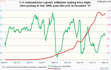 It is the same phenomenon in the ‘semiconductor and other electronic component’ category (Chart 4). Utilization peaked at 93.4 percent in July 2000, and has since persistently made lower highs. In the current cycle, it peaked last December at 77.9 percent. Capacity peaked in April 2014, but has been rising again since last August.