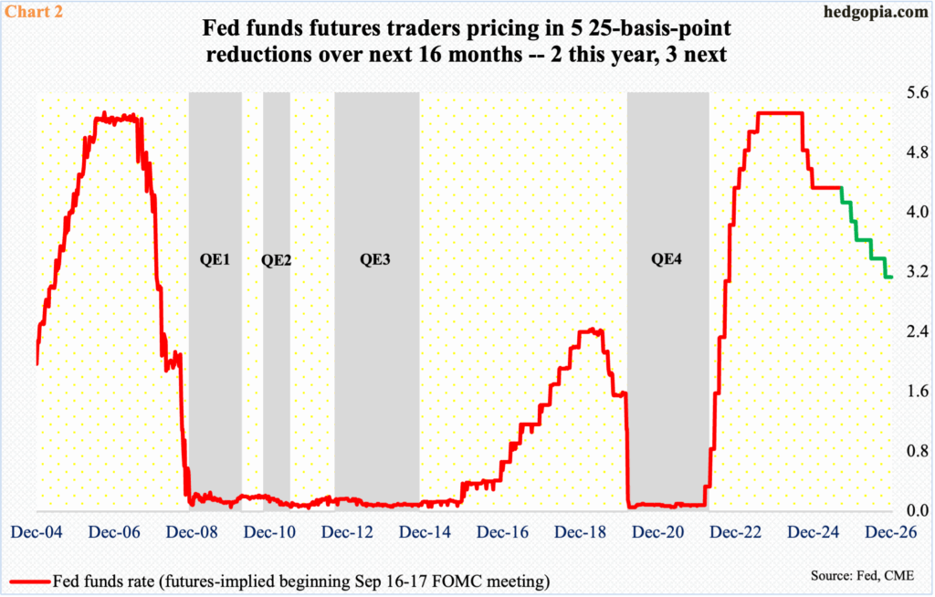 In the futures market, traders are currently betting with 87 percent probabilities that a 25-basis-point easing is locked in for next month, followed by another in December, then three more next year. Altogether, they are pricing in cuts equaling 125 basis points in the next 16 months (Chart 2).