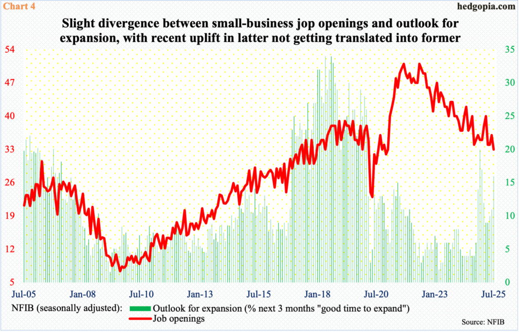 This is well and good, but this optimism is not getting translated into actual job openings, which in July declined three points m/m to 33, which was the lowest reading since December 2020.