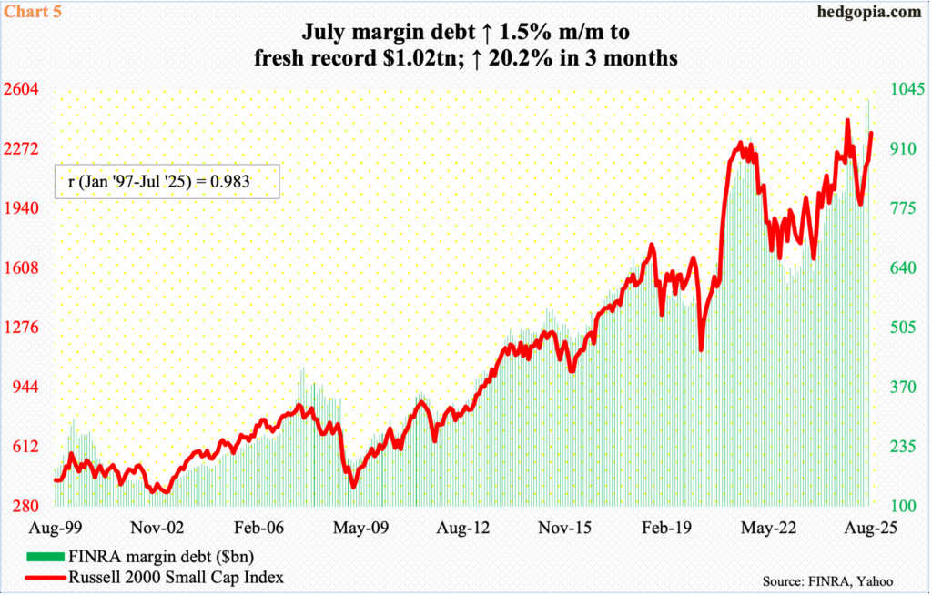 In April, FINRA margin debt hit a six-month low of $850.6 billion, before rising the next three months, reaching a fresh high of $1.02 trillion in July. This reflects the prevailing sentiment of risk-on. Small-caps historically are the same away. The Russell 2000 and margin debt do have a coefficient correlation of 0.98 going back to January 1997 (Chart 5). If this relationship holds, margin debt must have grown by a decent chunk this month.