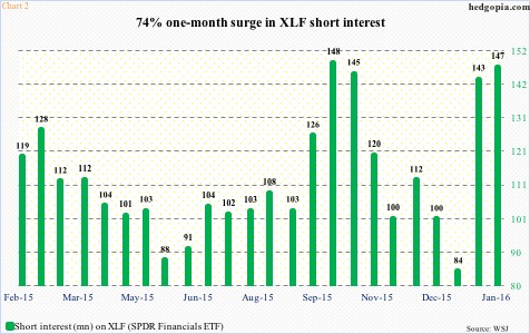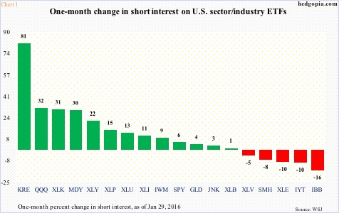 Chart 1 lays out one-month percent change beginning end-2015 in various U.S. sector/industry ETFs. Notice the spike in KRE, the SPDR Regional Banking ETF. Short interest went from 24.5 million at the end of last year to 44.4 million at the end of January. This year by January 25th the ETF was down 18-plus percent.