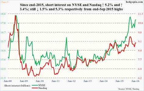 Shorts were picking and choosing their spots just right. On an index level, short interest has gone up, but not by a huge amount. In the one month since the end of last year, short interest on the NYSE composite rose 5.2 percent and on the Nasdaq composite 3.4 percent (Chart 3). Both indices are still below end-September (2015) highs.