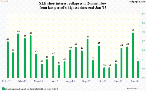 Except when it was all said and done, the January 15-29th period saw XLE reverse and end up 7.1 percent. Short interest went down big – from 49 million to 41 million (Chart 4). Shorts obviously took their gains, and at the same time decided not to continue to press.