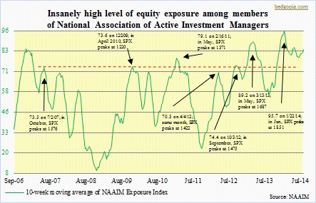Yesterday was the first time since April the S&P 500 Index violated its 50-day moving average – both simple and exponential. This was the first test since May, yet there was hardly any resistance from the bulls. Sellers simply overwhelmed buyers. The 1950 level is being closely watched by a lot of technicians and technically-minded investors/traders. The break has been convincing, so it is probable (1) potential buyers decide to watch from the sidelines and see what transpires next, and/or (2) shorts get active. Short interest can play an interesting role in this respect. Year-to-date, it has had a consistent month-over-month increase. The sooner equities stabilize, the higher the odds that some sort of short-covering takes place. On the other hand, a failure to do so would only embolden potential shorts. The second scenario is not out of the question, given how extended things are – from ultra-bullish newsletter writers to signals coming from the options market (SKEW and put-to-call ratio) to lofty levels of margin debt to divergences (small-caps, high-yield corporate bonds, financials, etc.). Increasingly, institutions in particular have been seeking shelter in big-caps. And things can only get stretched so far. The adjacent chart offers one more example of how extended things are. And this is an important group. Unlike newsletter writers, NAAIM member firms are active money managers, who hold the purse strings. While the Investors Intelligence survey provides a glimpse into investor sentiment, the NAAIM survey essentially tells us if there is any dry powder left. One look at the chart, and it does not take a genius to realize that they are all in. Needless to say, in a bull market that is in its sixth year, there is a lot of profit on paper. The Fed is only a few months away from ending its bond purchases. So it is not outside the realm of possibility that these managers try to preempt that and decide to lock in some of that profit. It is just a scenario, but if it indeed unfolds that way, it has the potential to feed on itself. Interesting few weeks lie ahead, at least!