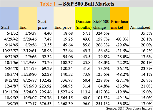 Thirteen bull markets going back to 1932 have been listed in the table.  Duration-wise, at 96 months the current one is the second longest, but in terms of performance it is the fourth most profitable.  Annualized, hence, current performance fares poorly – only outperforming three others (’57-’61, ’74-’80, and ’02-’07).