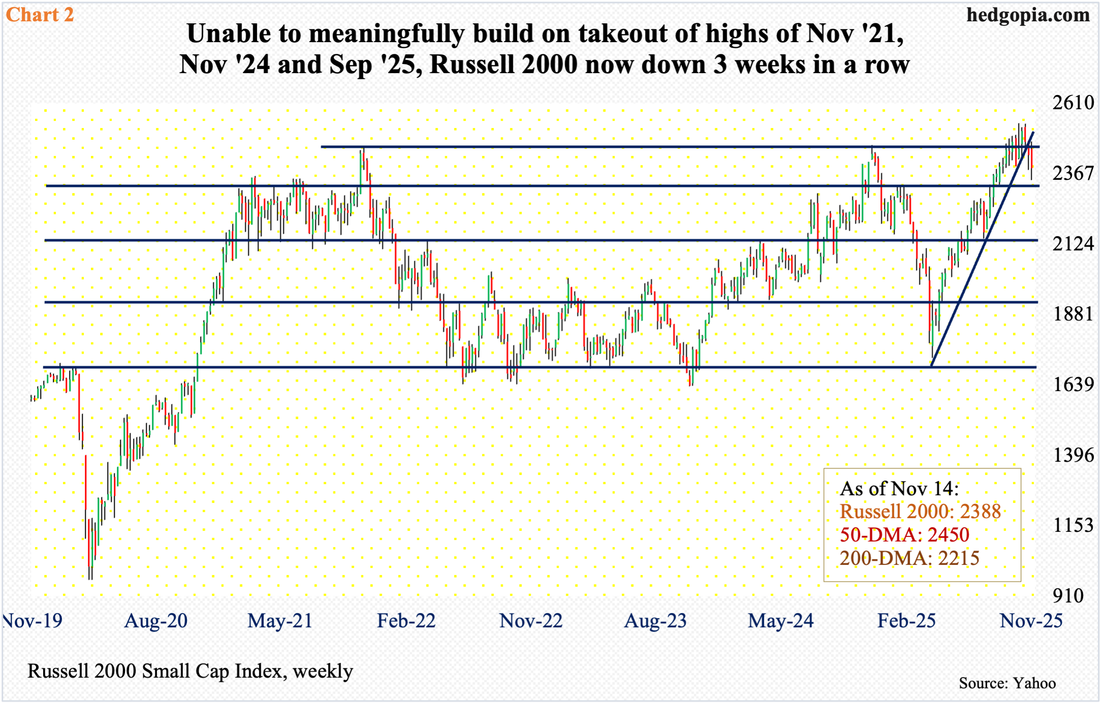 Small-cap bulls had a great opportunity to build on a major breakout, but they came up short. A year ago in November, the Russell 2000 retreated after ticking 2466. Three years before that, in November 2021, the index rallied to 2459 and reversed lower. This year, on 18 September, those highs were taken out, tagging 2470 intraday. In the subsequent weeks, the Russell 2000 then reached a new high of 2542 by October 15th before going sideways.