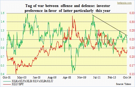 Monday’s rally attempt saw the S&P 500 fail at 1978 (September 24th low), so the aforementioned trendline break is still intact. Ditto with the Dow, as it came up 50 points short of reaching that resistance. The NYSE was 100 points short. The Naz unsuccessfully tried to take out its 50-day moving average. The Russell 2000 Small Cap Index was rejected by its shorter-term moving averages. It is not uncommon to face this kind of resistance given where things are. If things were strong, they probably would have smashed through resistance at the very first go. But they are not. There have been some trendline breaks. Bonds continue to diverge from stocks (adjacent chart), and market participants continue to prefer defensive sectors more than offensives (chart above). And small-caps were acting horrible leading up to the recent sell-off in general. The good thing is, bulls will have another crack at it. Yesterday, things were a little shaky in the morning. But post-release of the FOMC minutes, bids showed up. In the process, the Thursday low never got violated — important technically — matched by bullish engulfing patterns all around. By nature, the more times bulls manage to regroup and hit that resistance from underneath, the higher the odds that it cracks. Fingers crossed.