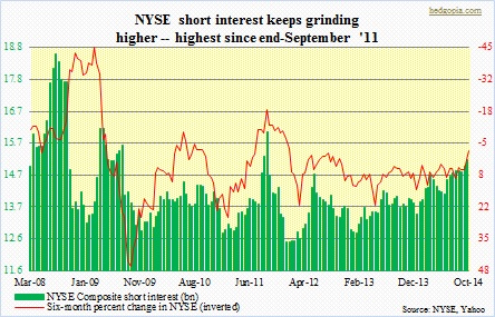 Shorts timed the decline in U.S. equities the past two weeks very well. From the middle of September to the end, short interest on the NYSE Composite rose 1.4 percent and 1.9 percent on the Nasdaq Composite. To be clear, it is not like shorts have suddenly been active. As shown in the adjacent chart and below, they have been raising bearish bets for a while now. That has particularly been the case on the NYSE, where short interest is at a three-year high. On the Nasdaq, mid-June this year it was at a six-year high, before retreating. The index went on to rally nearly seven percent in the next two and a half months, which probably resulted in some kind of squeeze. On the 19th (September), the index tested the September 3rd high and failed. Soon followed the drop (in stocks) of the past two weeks. It is probable shorts added to their positions in the wake of that technical failure. Whatever the case, their bets have paid off. But the bigger question is, Where to from here? The short-interest theory tells us that a large short interest presages a rise in the price. It is also called a cushion theory, as a squeeze potentially can act as a cushion.