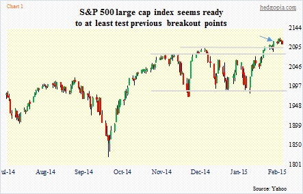 At first glance, U.S. equity indices could not be looking any better.  Most of the major ones recently had a breakout.  Had a marvelous February, with the S&P 500 large cap index up 5.5 percent in the month, the Nasdaq composite up 7.1 percent, the Dow Industrials up 5.6 percent, the Russell 2000 small cap index up 5.8 percent, and so on.  That is in a month we are talking about!chrt 1