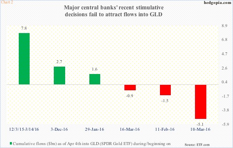 One would think these dovish policies would encourage aggressive purchases of the metal. On the contrary. Particularly since both March 10th and 16th, GLD saw outflows (Chart 2).