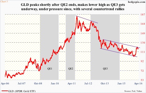 When the yellow metal peaked back then at $1924, the Fed had just ended its second iteration of quantitative easing. Gold headed lower. One year after that peak, QE3 got underway. Gold, however, failed to react positively. It continued lower. In fact, it broke down hard. Logically, QE should have been a tailwind, but was no longer helping (Chart 3 uses GLD, not spot gold). The collective wisdom of market had decided otherwise.