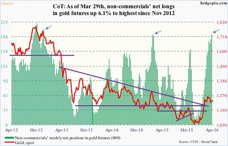 Going by non-commercials’ net longs in gold futures, sentiment is bullish. Too bullish? It is a tough call. The latest tally is comparable to the highs in January last year and September-November in 2012 (arrows in Chart 4). On both occasions, off the highs, net longs began to subside, and gold went along with it.