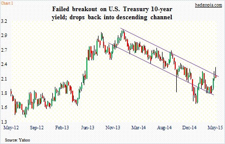 In the middle of last week, the 10-year yield broke out of its December 2013 downward sloping trendline, but could not hang on to it (Chart 1).  The 30-year remains above resistance (Chart 2), but barely.