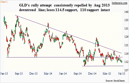 This probably explains why a sharp drop in GLD’s short interest has not helped the ETF as it normally would/should. At the end of May, short interest stood at 18.4 million, and declined 27 percent in the next two weeks, to 13.4 million (Chart 3). All that short-covering pretty much went in vain. GLD went from $114.1 to $113.73 during the period. By then, it had already broken important support. For two-plus years until October 2014, the ETF consistently found support at $114.50. Once that gave way, it dropped to $109.67 intra-day in November. That low was tested again in March – successfully.