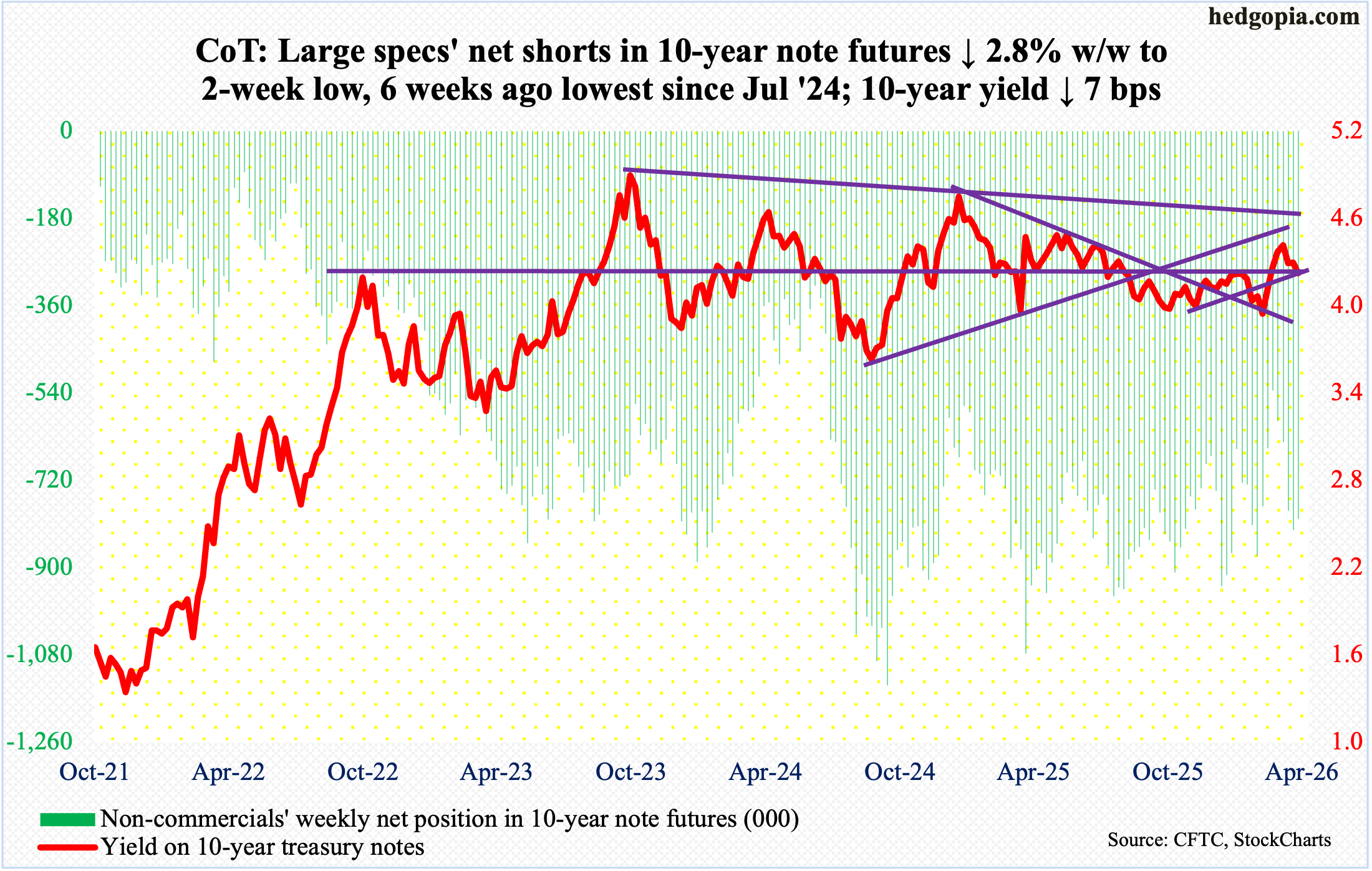 Following futures positions of non-commercials are as of April 7, 2026. 10-year note: Currently net short 823.6k, up 39.6k. Non-commercials are once again aggressively adding to net shorts in 10-year futures, with the holdings up 58 percent from a 20-month … Continued