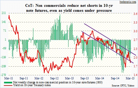 The following are futures positions of non-commercials as of March 24, 2015.  Change is week-over-week. 10-year note: After what these traders heard out of the FOMC last week, they decided to step on the accelerator.  Net shorts went up 67 … Continued