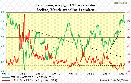 FXI accelerates decline, breaks six-month trendline