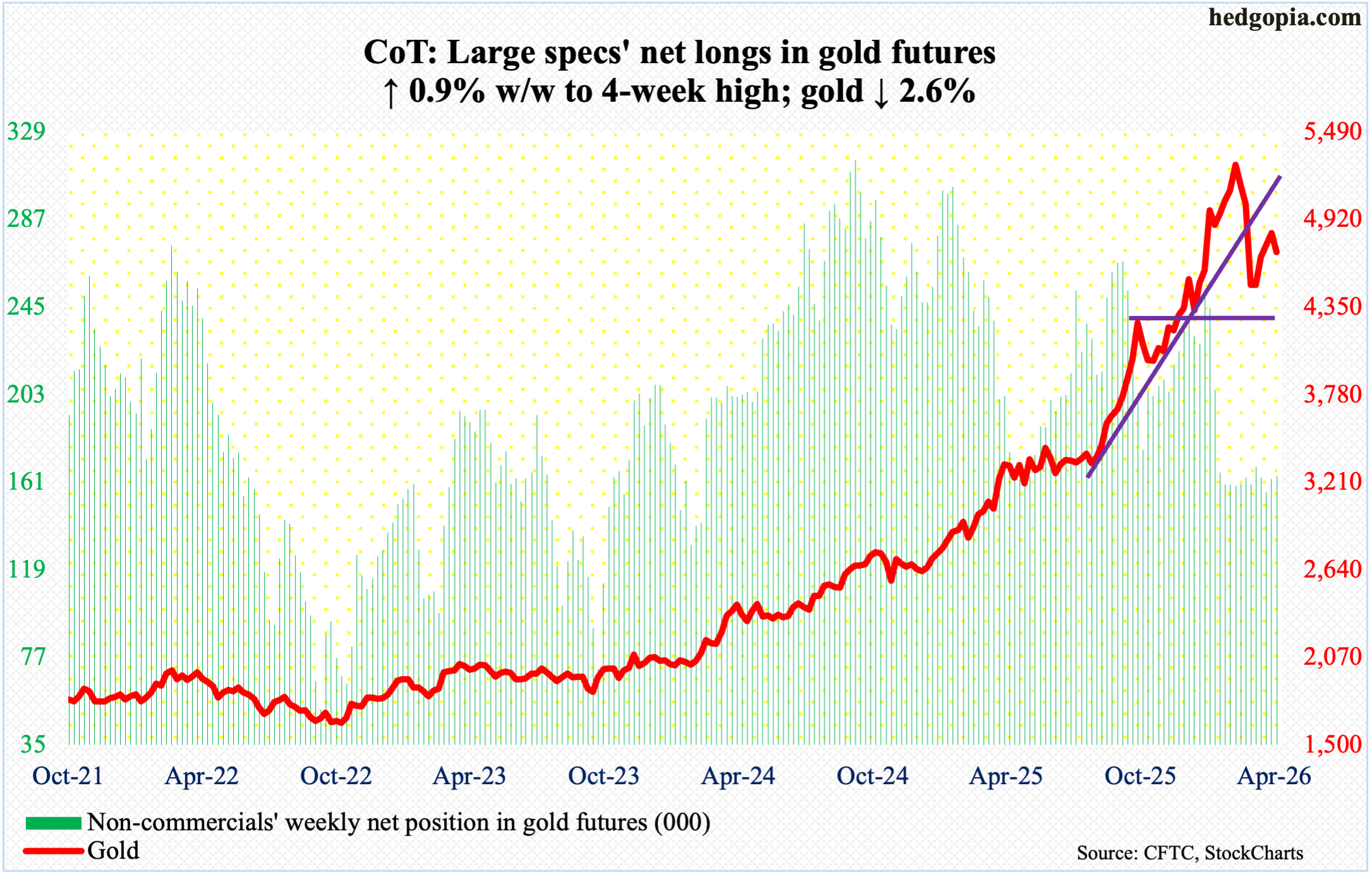 Following futures positions of non-commercials are as of April 21, 2026. 10-year note: Currently net short 791k, down 9.4k. The FOMC (Federal Open Market Committee) meets next week. Five more scheduled meetings remain after this for this year. The fed … Continued