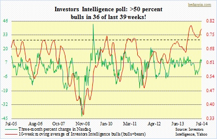 Newsletter writers continue to defy gravity, yet have so far been on the right side of trade. The latest edition of the Investors Intelligence survey shows bulls at 56.5 percent, essentially unchanged week-over-week. Except for three weeks in February in … Continued