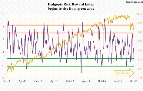 Near-term, the path of least resistance is up – also suggested by the Hedgopia Risk Reward Index. The Friday reversal needs the benefit of the doubt, especially having come amidst the prevailing gloomy sentiment.