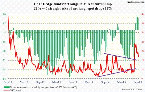 VIX: Non-commercials have stayed net long for six straight weeks, during which spot VIX contracted by north of seven points. With that said, in the very first week they went net long, the spot did spike to 53.29 (August 24th) before reversing.