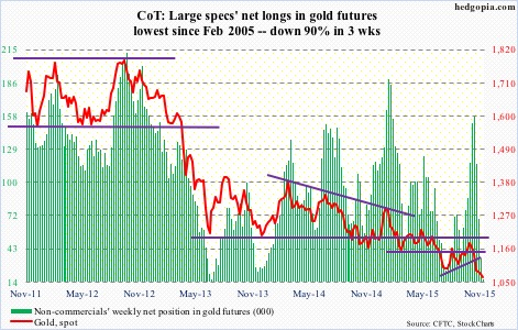 In the meantime, non-commercials’ net longs have dropped to the lowest since February 2005. Back then, net longs began to rise after bottoming at 11.2k contracts.