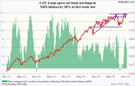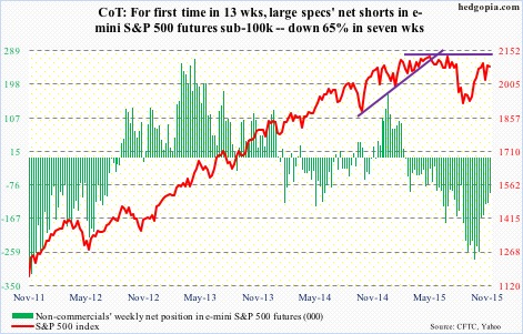 Non-commercials continue to cut back net shorts – now sub-100,000 contracts – and that has helped stocks.