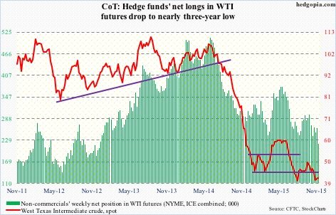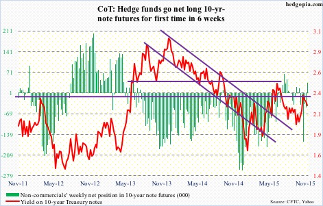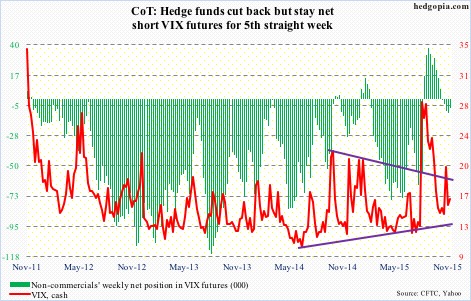 The following are futures positions of non-commercials as of November 24, 2015. Change is week-over-week. (Due to Thanksgiving last week, the CFTC released numbers on Monday, instead of last Friday.)