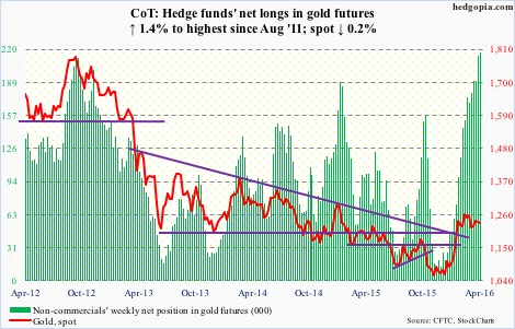 That said, non-commercials continue to exude confidence, with net longs rising to the highest since August 2011.  The problem is, gold has lost ground in the past couple of weeks – although ever so slightly.