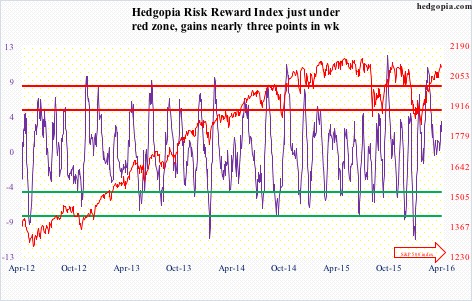 Similarly, in four of the past six weeks, the VIX-to-VXV ratio has been sub-0.80, with the March 14th week producing a reading of 0.782 – a one-year low.  The other two weeks are in the low 0.80s.  This is too low a reading for too long a duration.