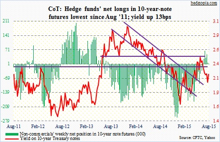 The following are futures positions of non-commercials as of August 25, 2015. Change is week-over-week. (Please keep in mind that these holdings are as of Tuesday. By then, from high to low the S&P 500 was down 12.5 percent. In the next three sessions, it rallied 6.5 percent to end the week up 0.9 percent. So holdings may have changed substantially.)