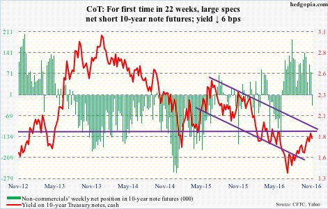 From the July 6th all-time low of 1.34 percent through the November 1st high of 1.88 percent, it rallied 54 basis points. Yields are past both 50- and 200-day moving averages.