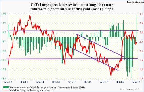 In the week ended February 28, non-commercials had the most net shorts ever in 10-year-note futures – 409,659 contracts. By Tuesday this week, they switched to net long 214,642 contracts, which were the highest since March 2008. It is a swing of 624,000-plus contracts in eight weeks! This probably played a role in yields dropping from 2.62 percent on March 10 to the afore-mentioned low.