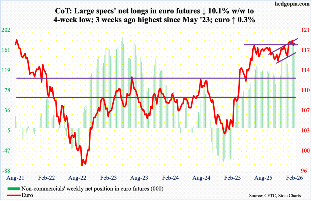 Despite a four-and-a-half-year high $1.208 reached on 27 January, the euro has essentially straddled $1.18, or just north of it, since at least last June. In January last year, the euro bottomed at $1.018. One year later, it ticked $1.208; in the week in which that high was attained, a gravestone doji, which is a bearish pattern, developed.
