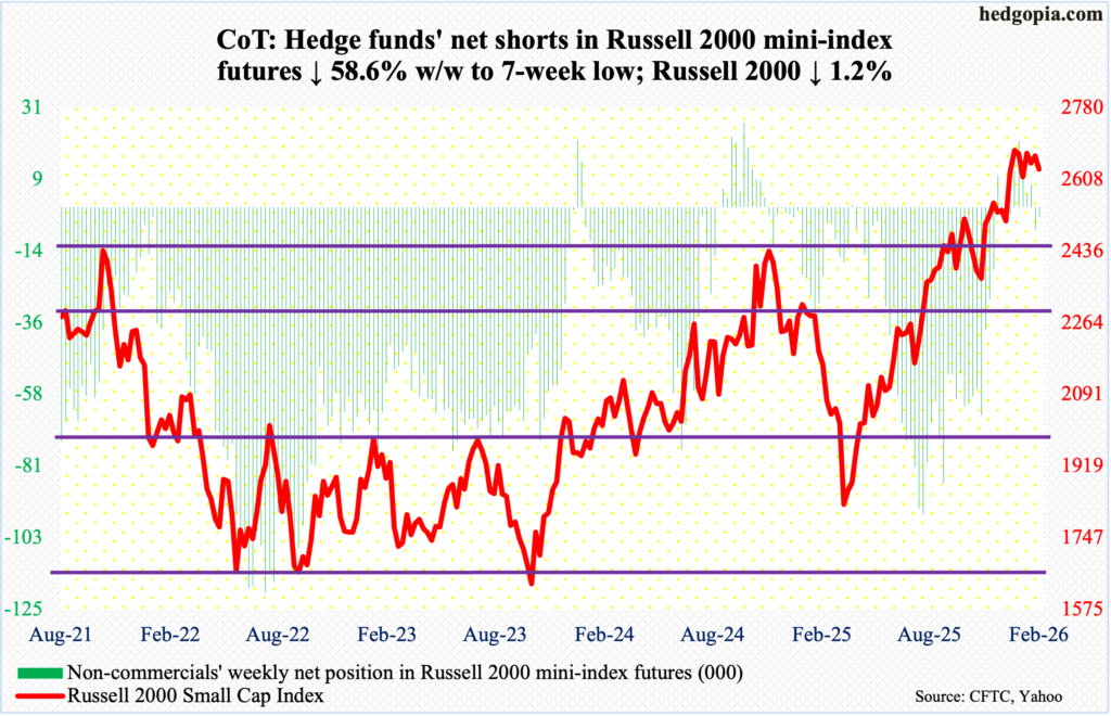 Russell 2000 mini-index: Currently net short 2.9k, down 4.2k.