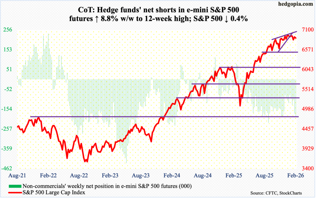 E-mini S&P 500: Currently net short 193.5k, up 15.7k.