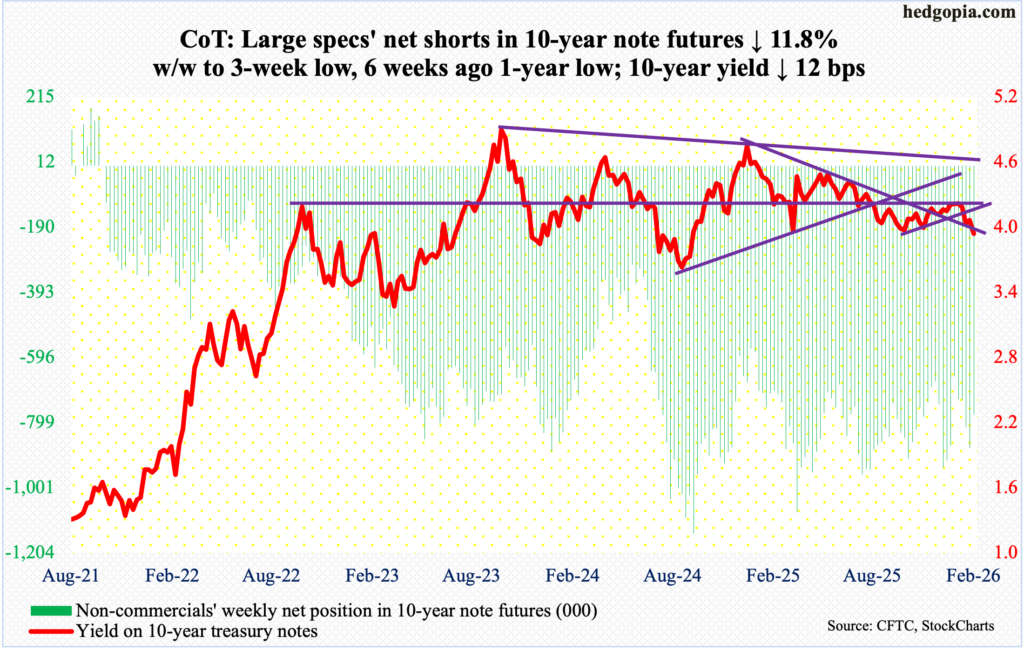 This week, the 10-year T-yield gave back 12 basis points to slide under four percent. Rates gapped down Friday to close at 3.96 percent. This is not what non-commercials are positioned for. Heavily net short 10-year note futures, they are betting on/hoping for higher rates. In February alone, the 10-year dropped 28 basis points.