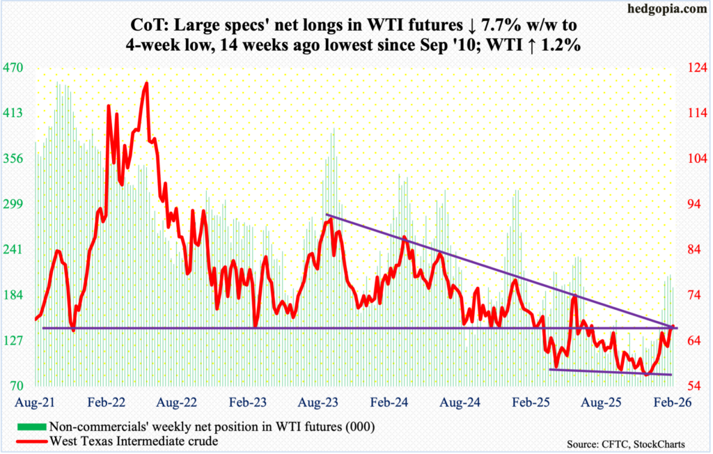 WTI crude oil: Currently net long 194.5k, down 16.2k.