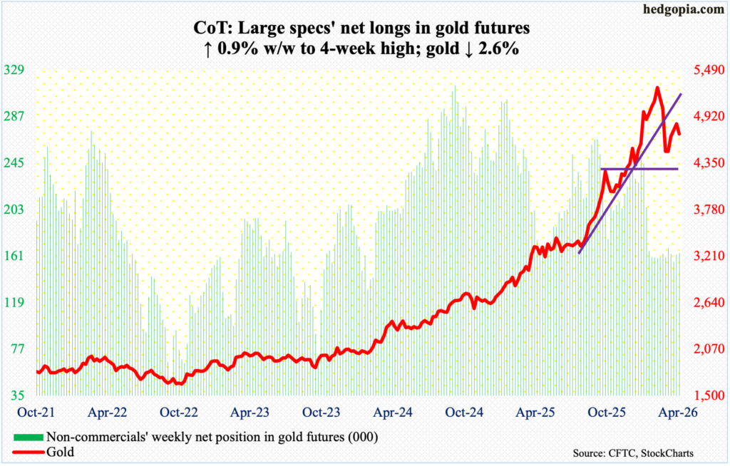 Gold: Currently net long 162.5k, up 6.2k.