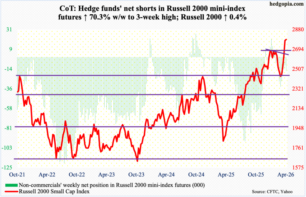 Russell 2000 mini-index: Currently net short 15.9k, up 6.6k.