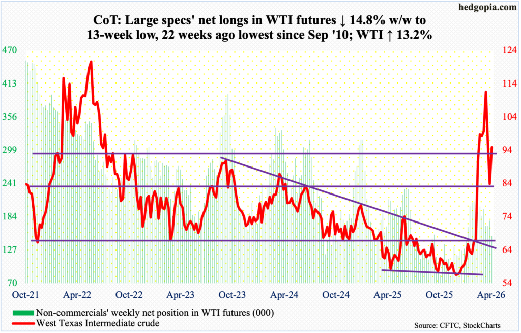 WTI crude oil: Currently net long 151.3k, down 26.2k.