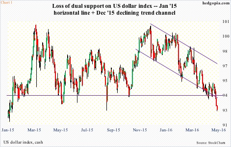 The US dollar index (92.62) shed another 0.4 percent Monday, and lost another support, this time dropping out of a five-month channel.