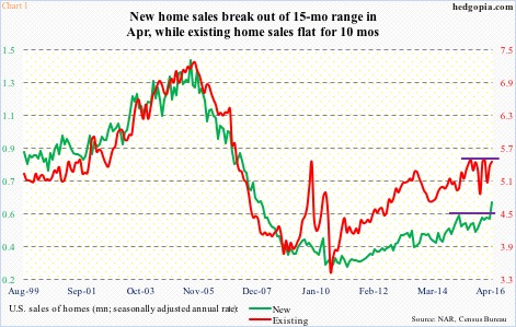 This week, May’s existing and new home sales data come out – on Wednesday and Thursday, respectively. In April, the former rose 1.7 percent month-over-month to a seasonally adjusted annual rate of 5.45 million units, and has essentially gone sideways since June last year. The latter jumped 16.6 percent to 619,000 units (SAAR) to break out of 15-month consolidation (Chart 1).