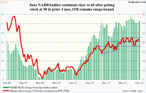 This is reflected in builder sentiment, which stayed stuck at 58 for four months to May. June inched up to 60, but was still below 65 last October, which was a 10-year high. Chart 2 plots builder sentiment against ITB, the iShares US home construction ETF. The two track each other well.