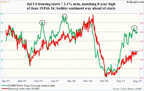 In July, starts rose 2.1 percent month-over-month to a seasonally adjusted annual rate of 1.21 million units, matching cycle highs of February 2016 and June 2015. These were the highest since 1.26 million in October 2007. Chart 1 shows the sideways pattern starts have been in for over a year now.